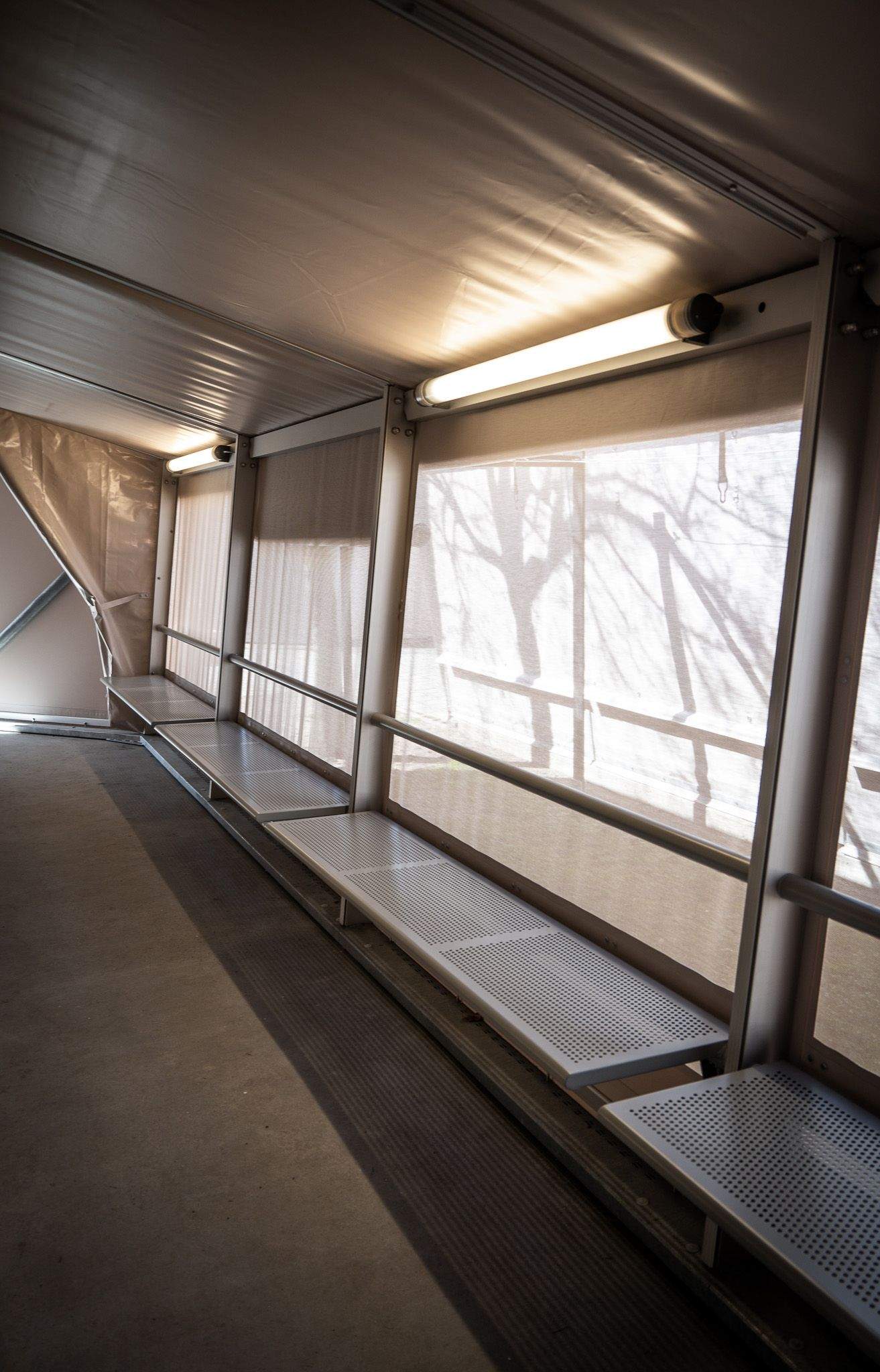 Particular attention was given to the interaction between structural behaviour and detailing. The frame was developed as a semi-rigid system, allowing the removal of visible bracing members and supporting a cleaner and more open interior space. The textile envelope required an equally specific response. Because the reflective membrane surface imposed limitations on standard welding methods, several conventional fabrication details had to be rethought and adapted.