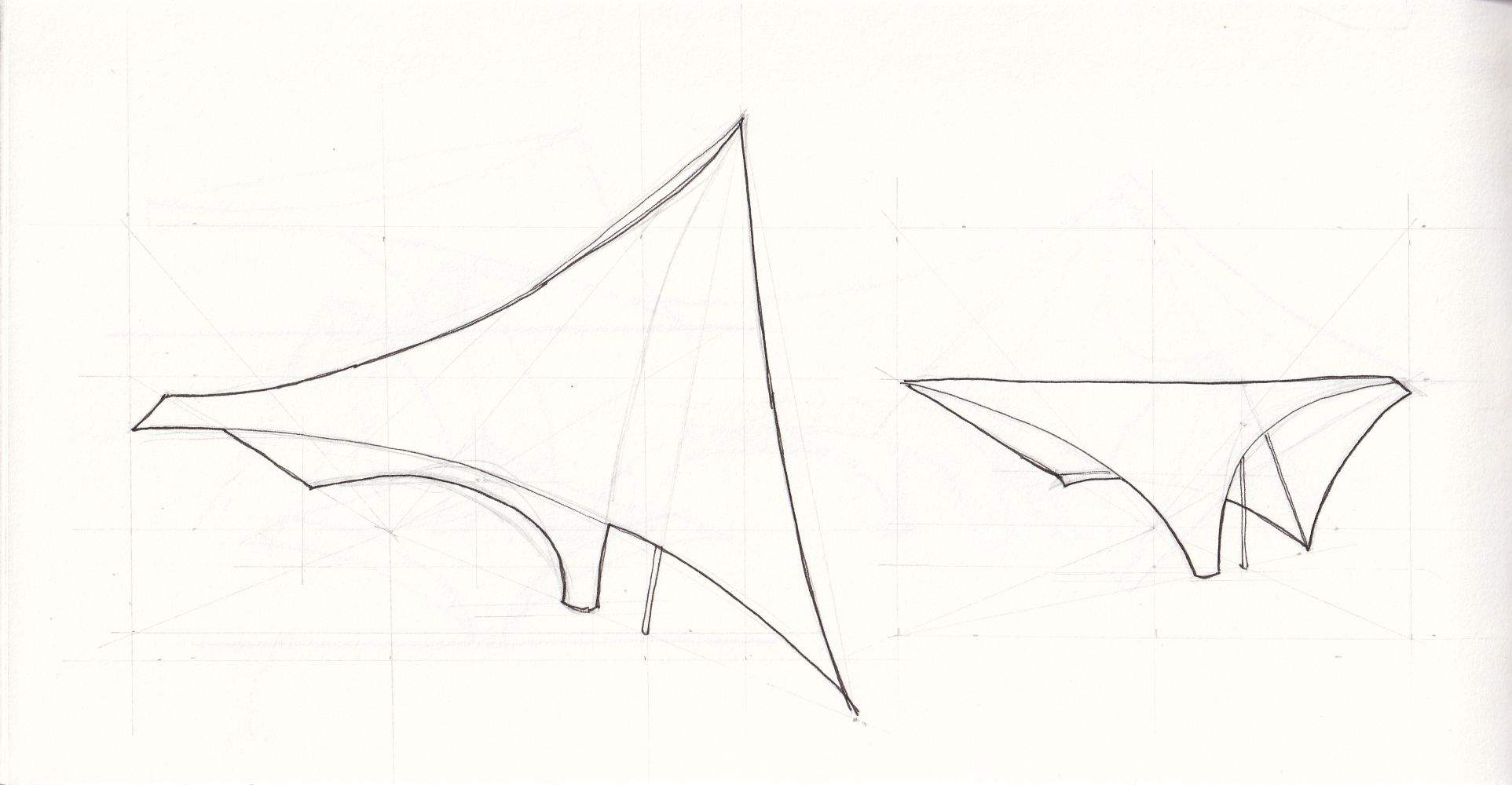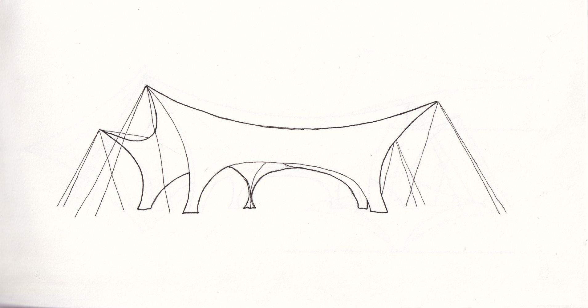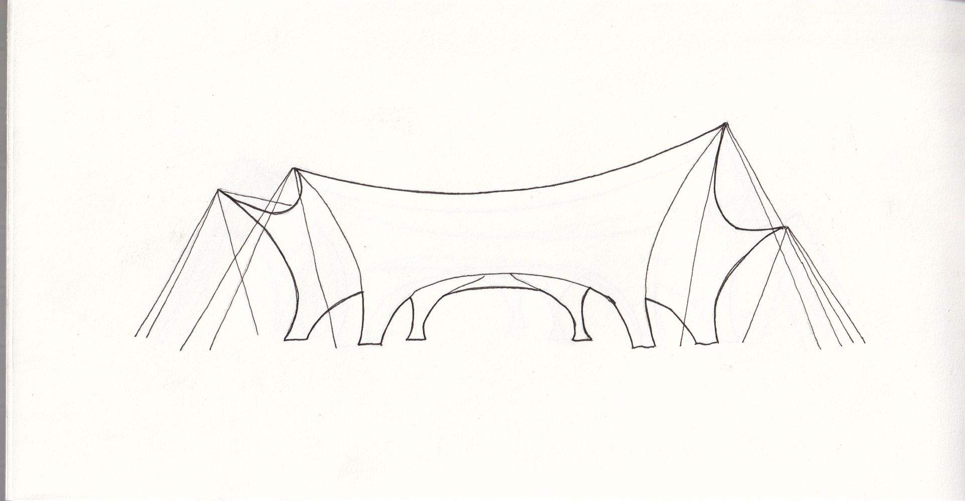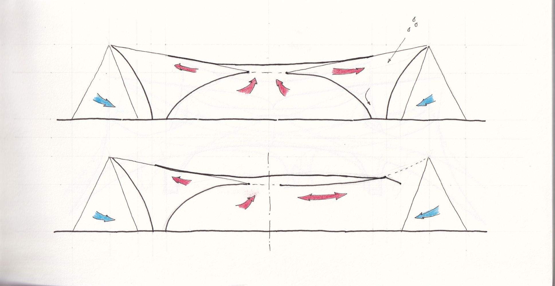 To avoid conflicts from external guying, I reshaped the canopy so that parts of the membrane surface provide the bracing themselves.
