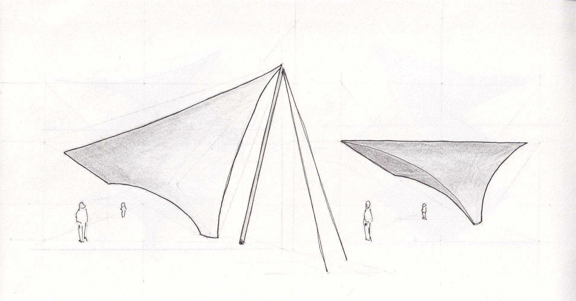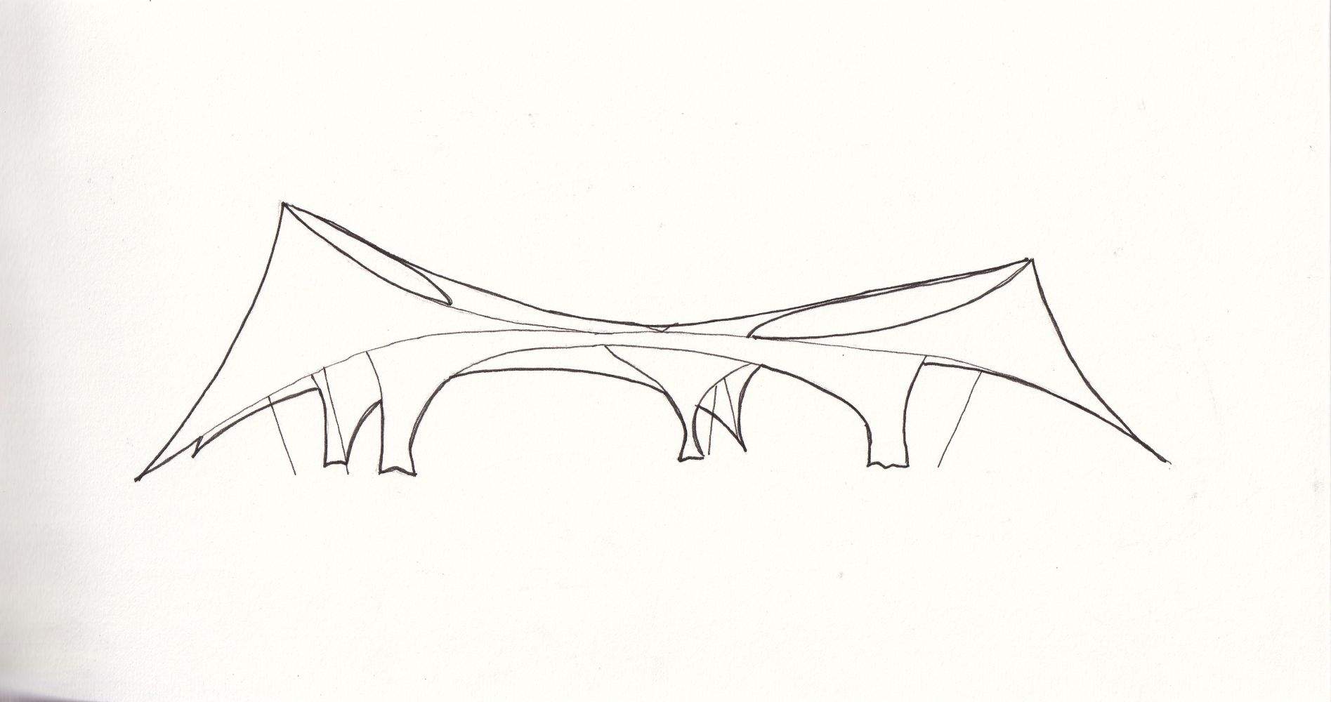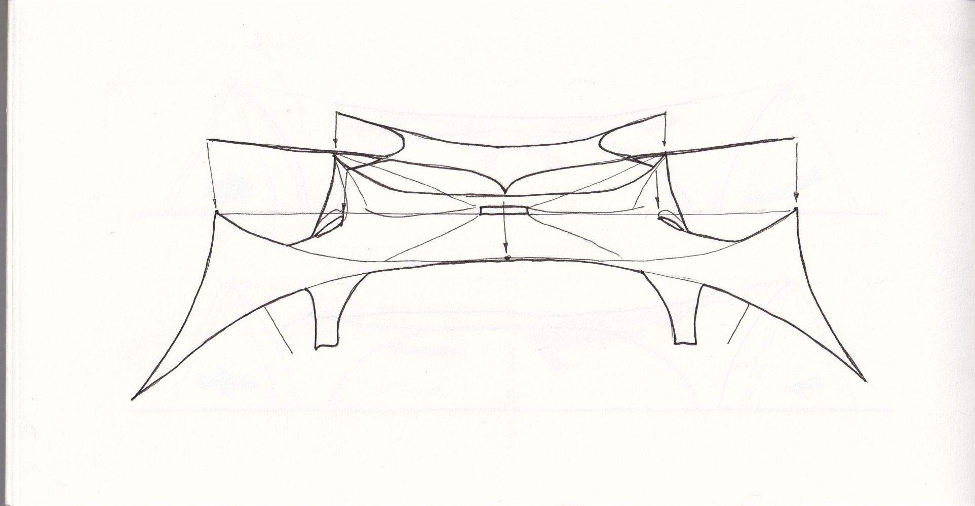 To avoid conflicts from external guying, I reshaped the canopy so that parts of the membrane surface provide the bracing themselves.