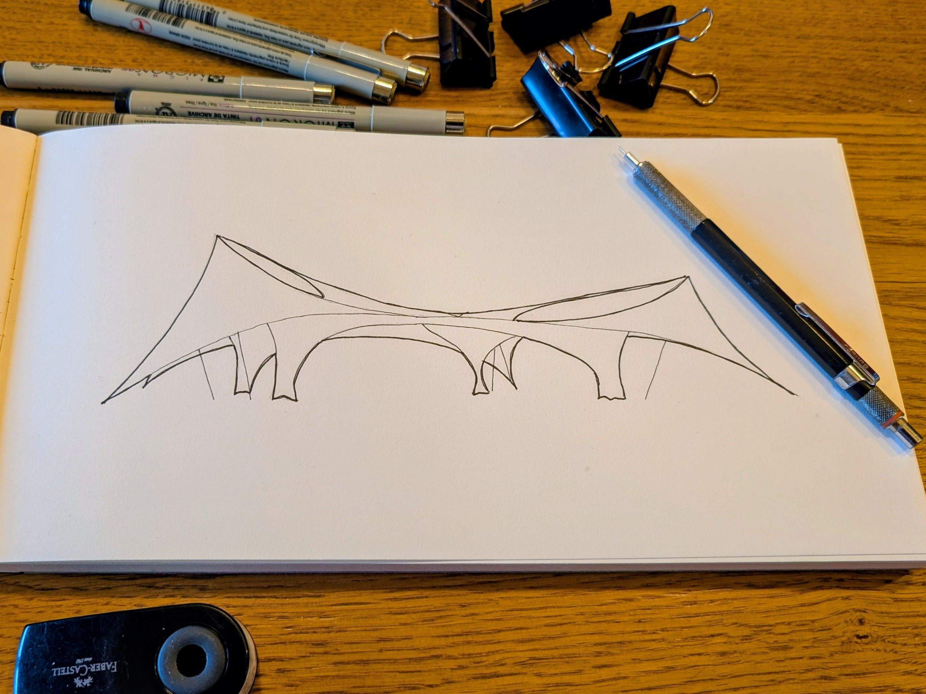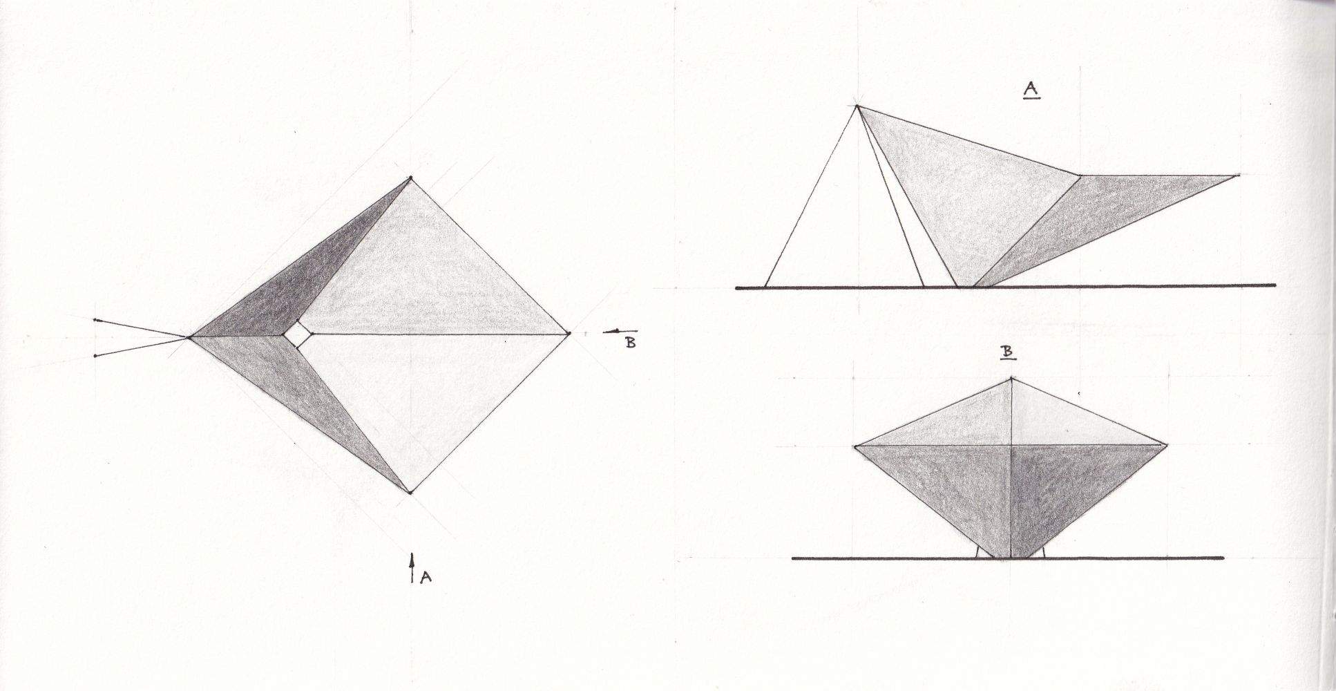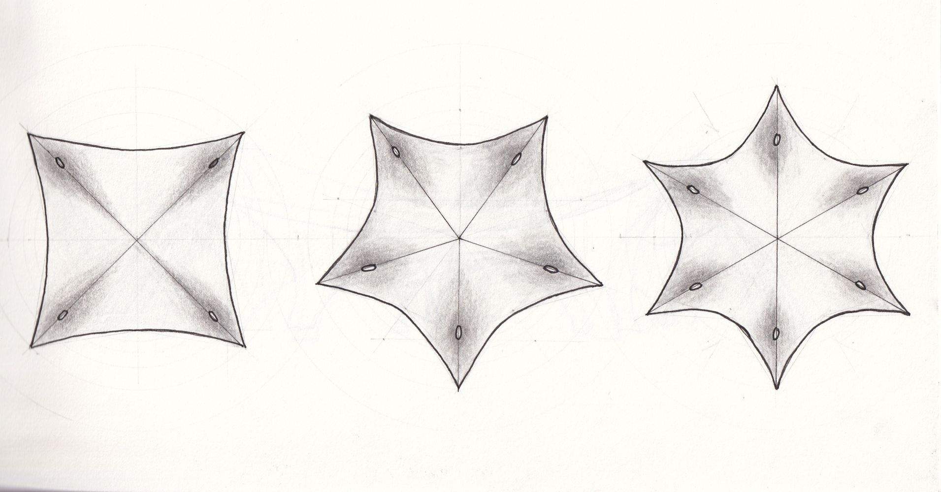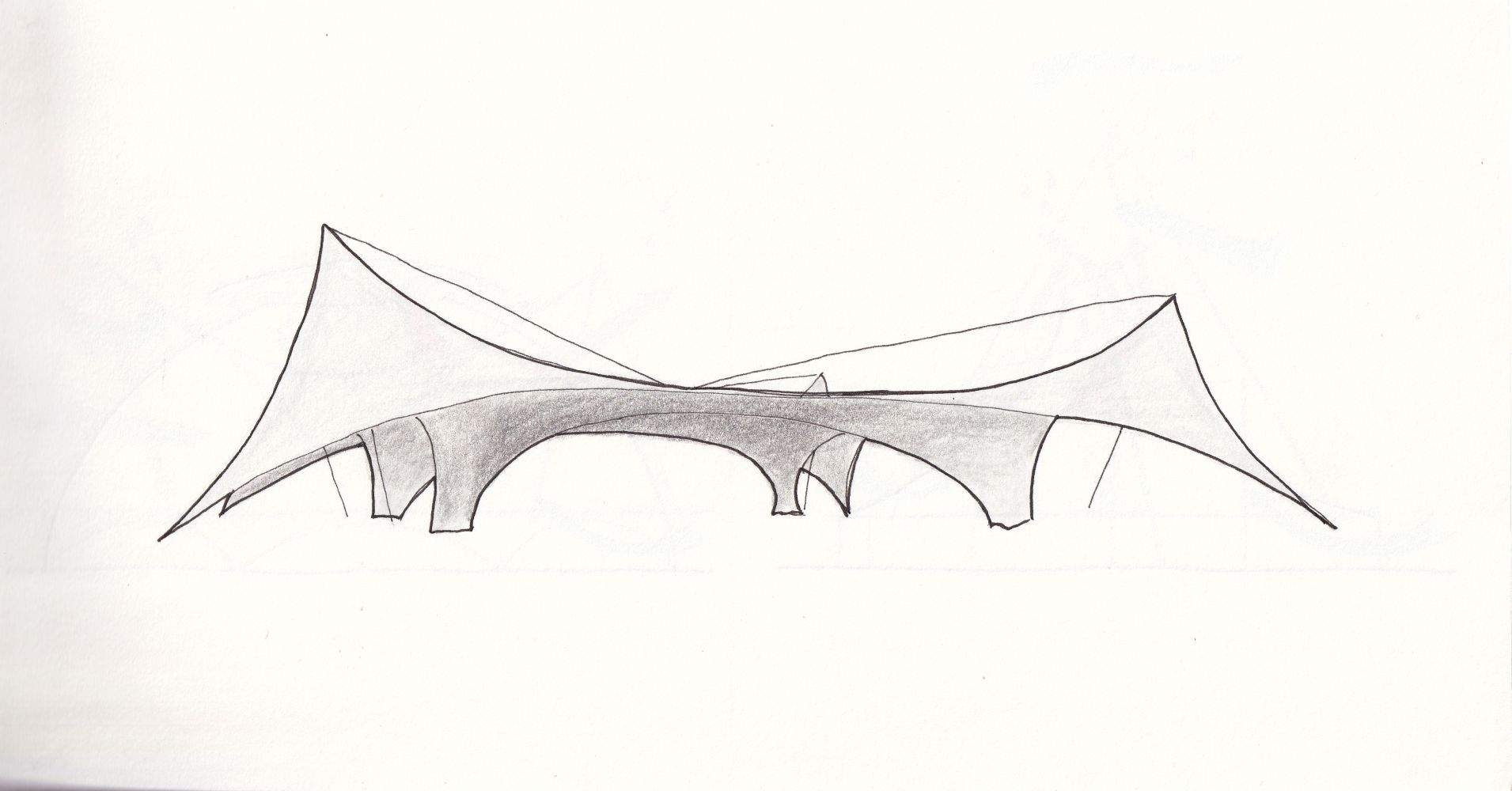 To avoid conflicts from external guying, I reshaped the canopy so that parts of the membrane surface provide the bracing themselves.