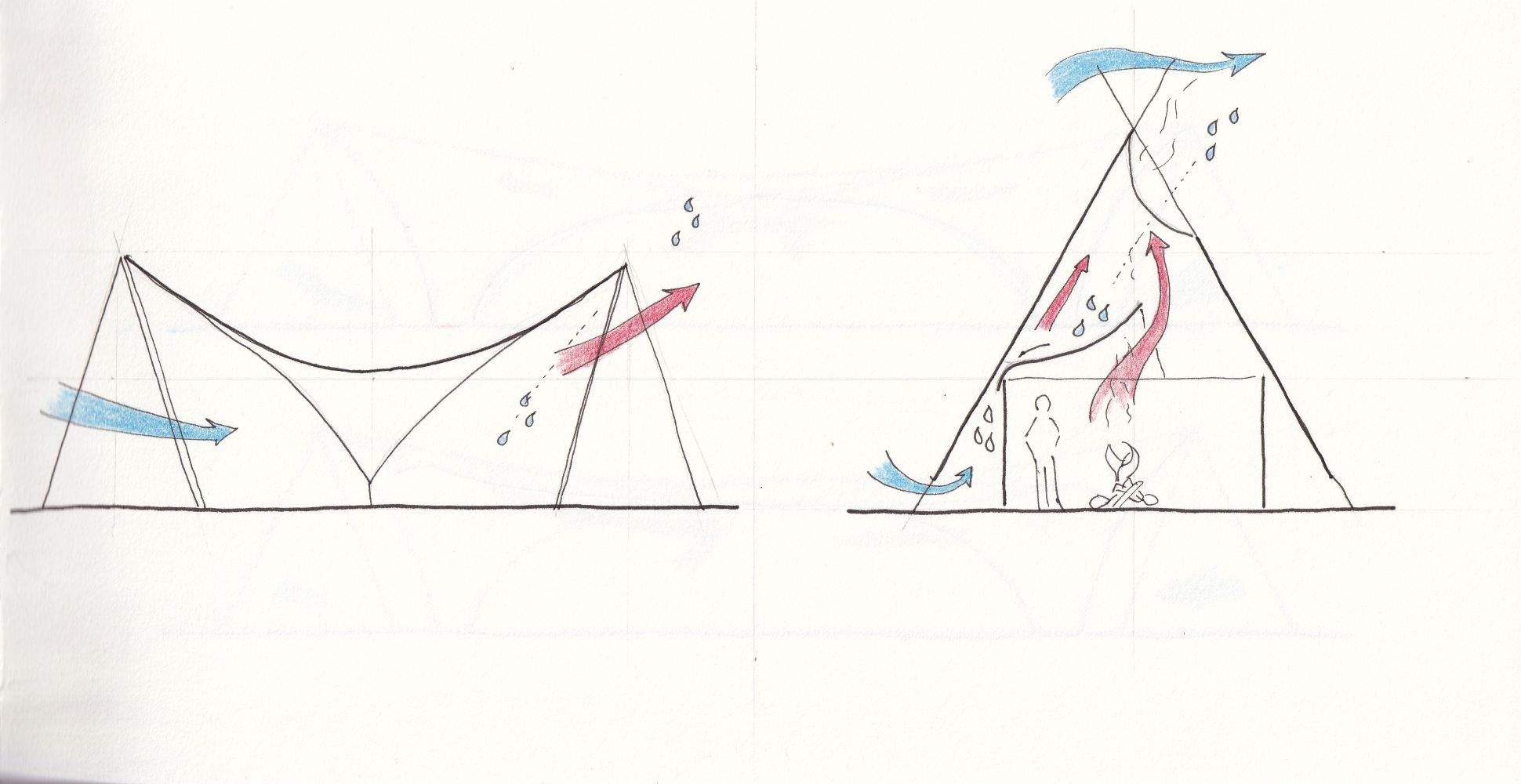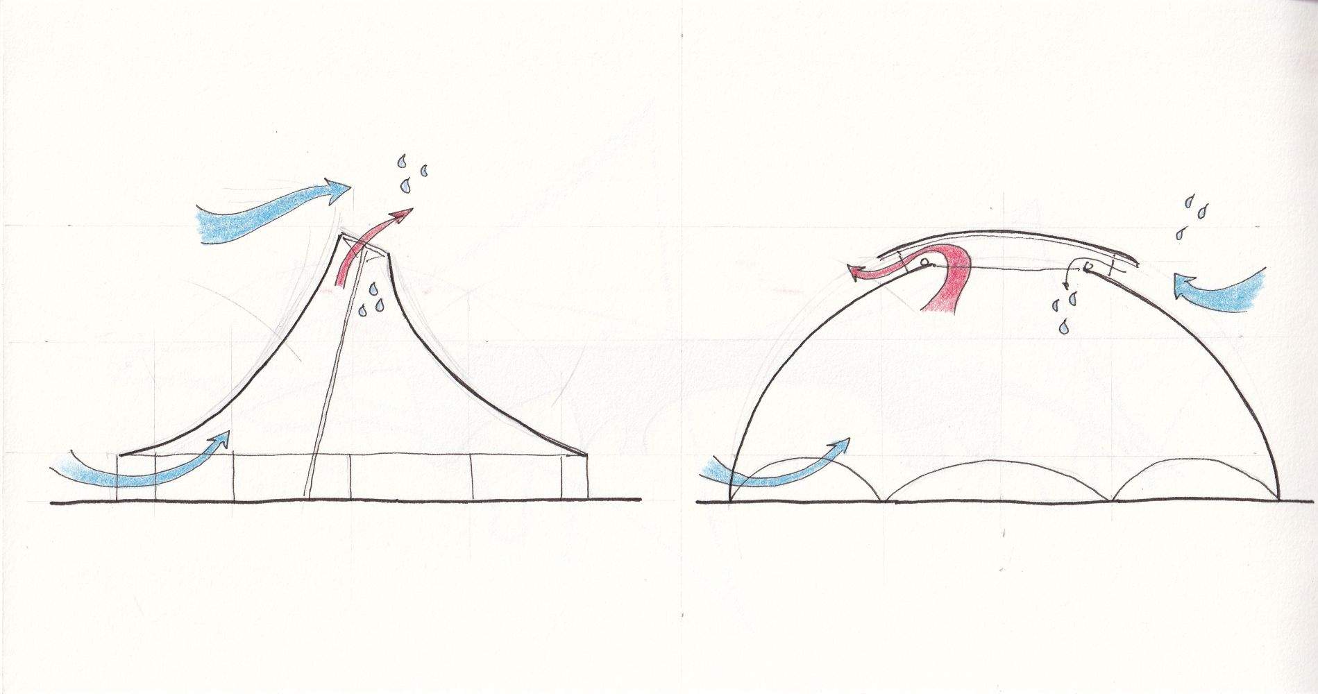 A section through the canopy highlights the central zone as a potential hotspot: it’s the most effective location for a vent opening, yet also the most exposed.