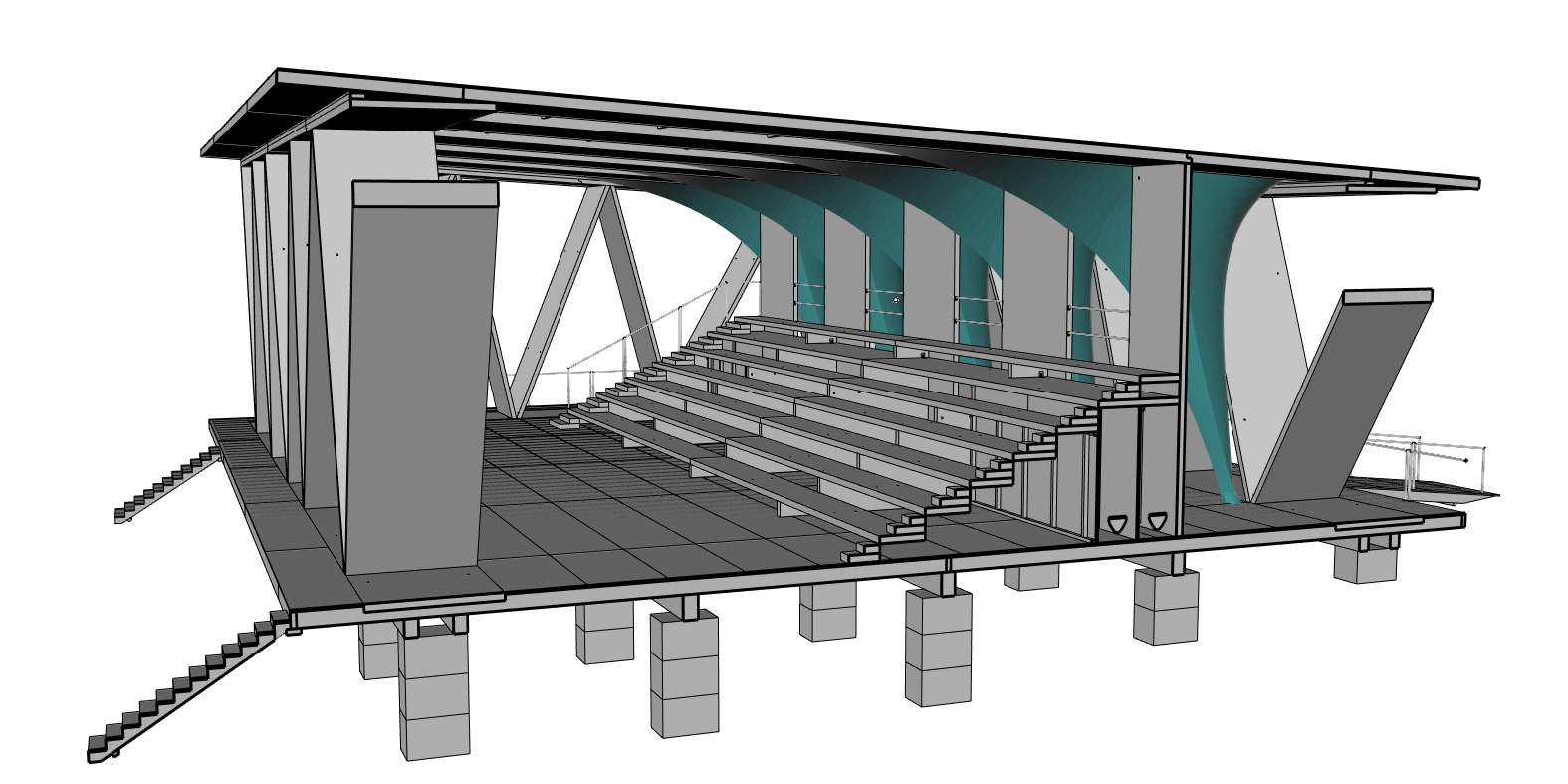 The impulse for this study came from an earlier design for a temporary open-air stage canopy. The roof was conceived as a timber plate with openings acting as skylights. A membrane would provide the waterproofing layer and close the skylights translucently.